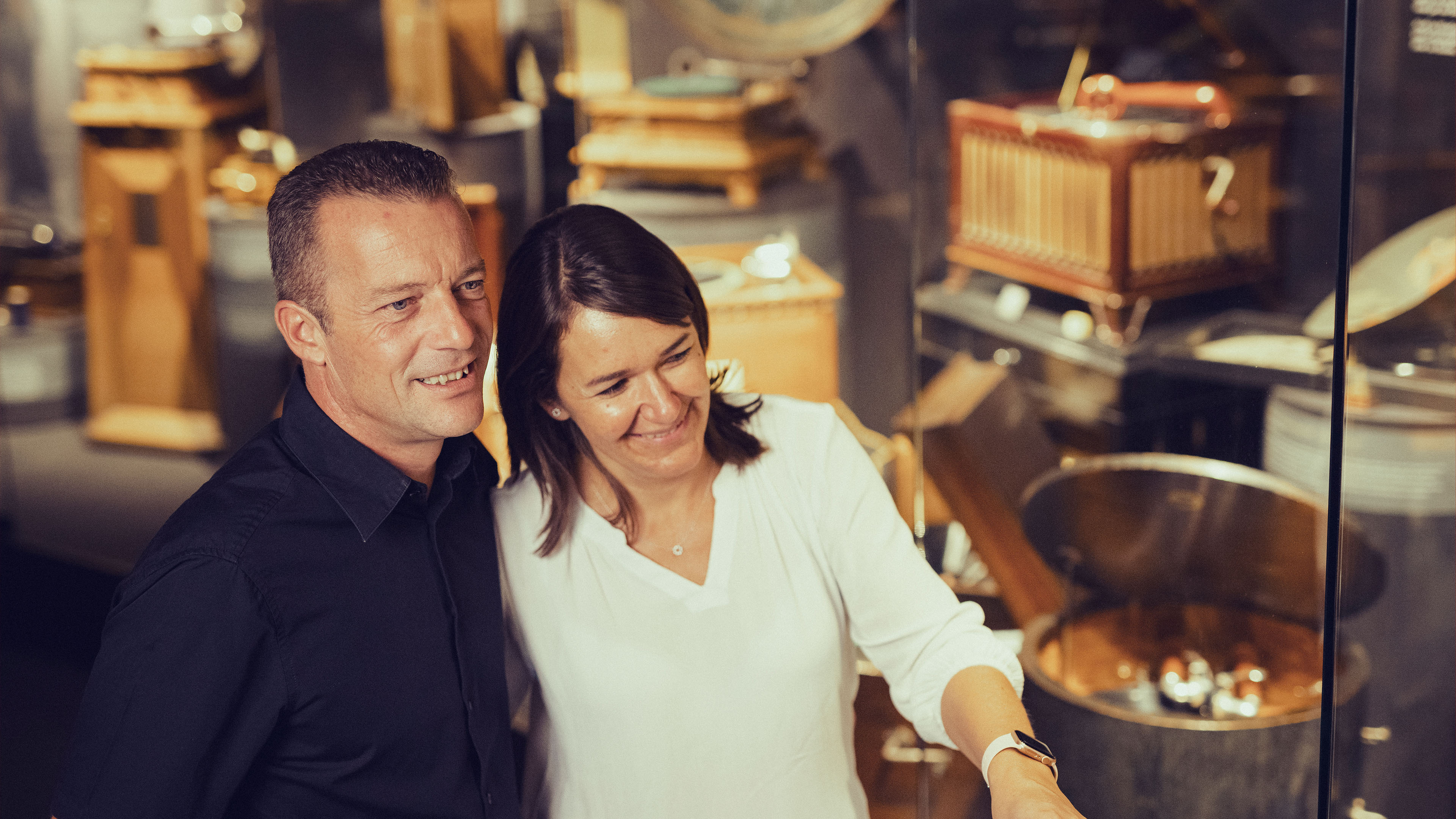 In Assoziation zu einer Schallplatte präsentiert sich das Grammophonicum als kreisrunder Vitrinenbau. Die Idee stammt vom Büro „raumhochrosen“ und begeistert die Besucher immer wieder aufs Neue. Auch die ganz besonderen Sammelstücke von Reinhard Häfele sorgen für staunende Blicke. Mehr als 70 Phonographen und Grammophone, sowie Tonträger und Zubehör gelten international als kostbare Raritäten.